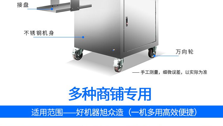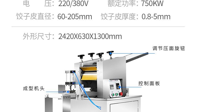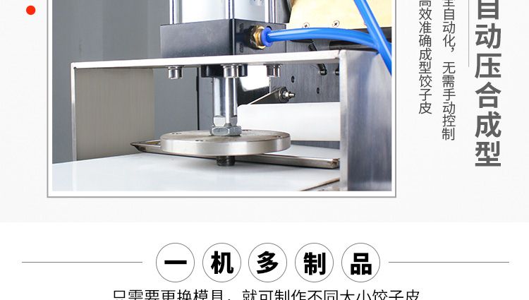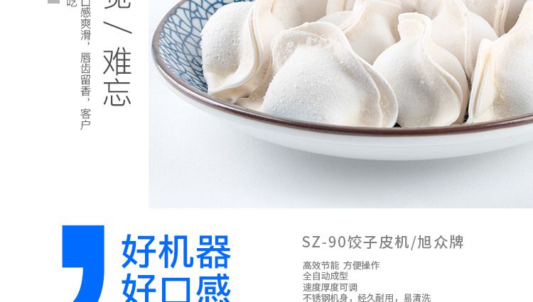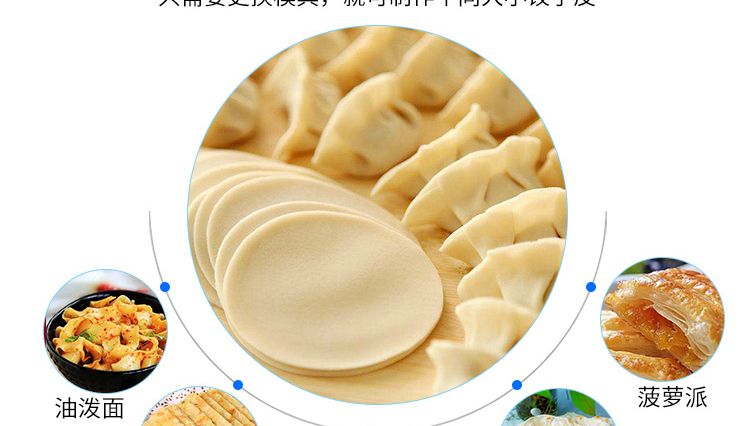 JGB-90型餃子皮機是我公司開發(fā)生產(chǎn)的先進餃子皮生產(chǎn)設(shè)備??梢院唵胃鼡Q模具(可根據(jù)客戶定制不同形狀、尺寸的模具),本設(shè)備采用氣缸運動。本廠生產(chǎn)的90餃子皮機,采用多道壓面輥壓面,壓面效果優(yōu)異,壓出的面皮筋道,進一步提高所包出的餃子口感。