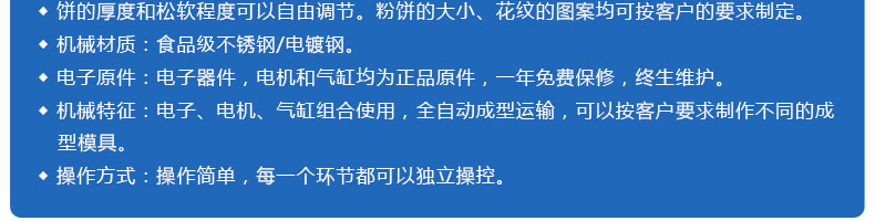 ◆餅的厚度和松軟程度可以自由調(diào)節(jié)。粉餅的大小、花紋的圖案均可按客戶的要求制定。