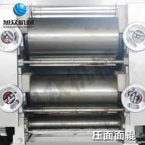 將攪拌好的面粉均勻的放進去,面對輥將松散的面粉初壓成面皮,合皮部分有一對軋輥,它將兩層復(fù)合面皮合成一層,延軋部分由兩對軋輥組成,將面皮軋成所需的厚度,切條部分是將一定厚度的面皮切成所需寬度的面條,上門架部分把切斷后的面條自動挑起。